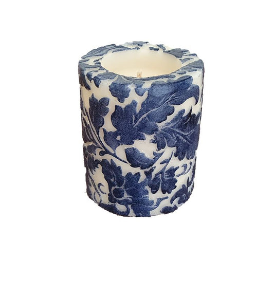 Natural Lights - Damask Leaf 3” Recessed Pillar Candle - White and Tattoo Blue